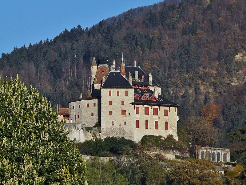 Château de Menthon, Château datant du 13e siècle se situant à Menthon-Saint-Bernard (74) dans la région Rhône-Alpes. Actuellement Propriété d'une personne privée. inscrit aux Monuments Historiques (1989).Les trois grosses tours remontent au Moyen-Age. Le château se transforme à la Renaissance : des appartements remplacent les chemins de ronde entre les tours. L’aspect général de l’édifice se maintient jusqu’en 1740, date de nombreux aménagements de confort. De 1880 à la première gerre mondiale, des travaux confèrent au château sont aspect actuel, dans un goût marqué pour les châteaux de Louis II de Bavière, avec création de tourelles, d’une galerie à colombage et remaniement intérieur[1]data.culture.gouv.fr la plate-forme de données ouvertes du ministère de la Culture.